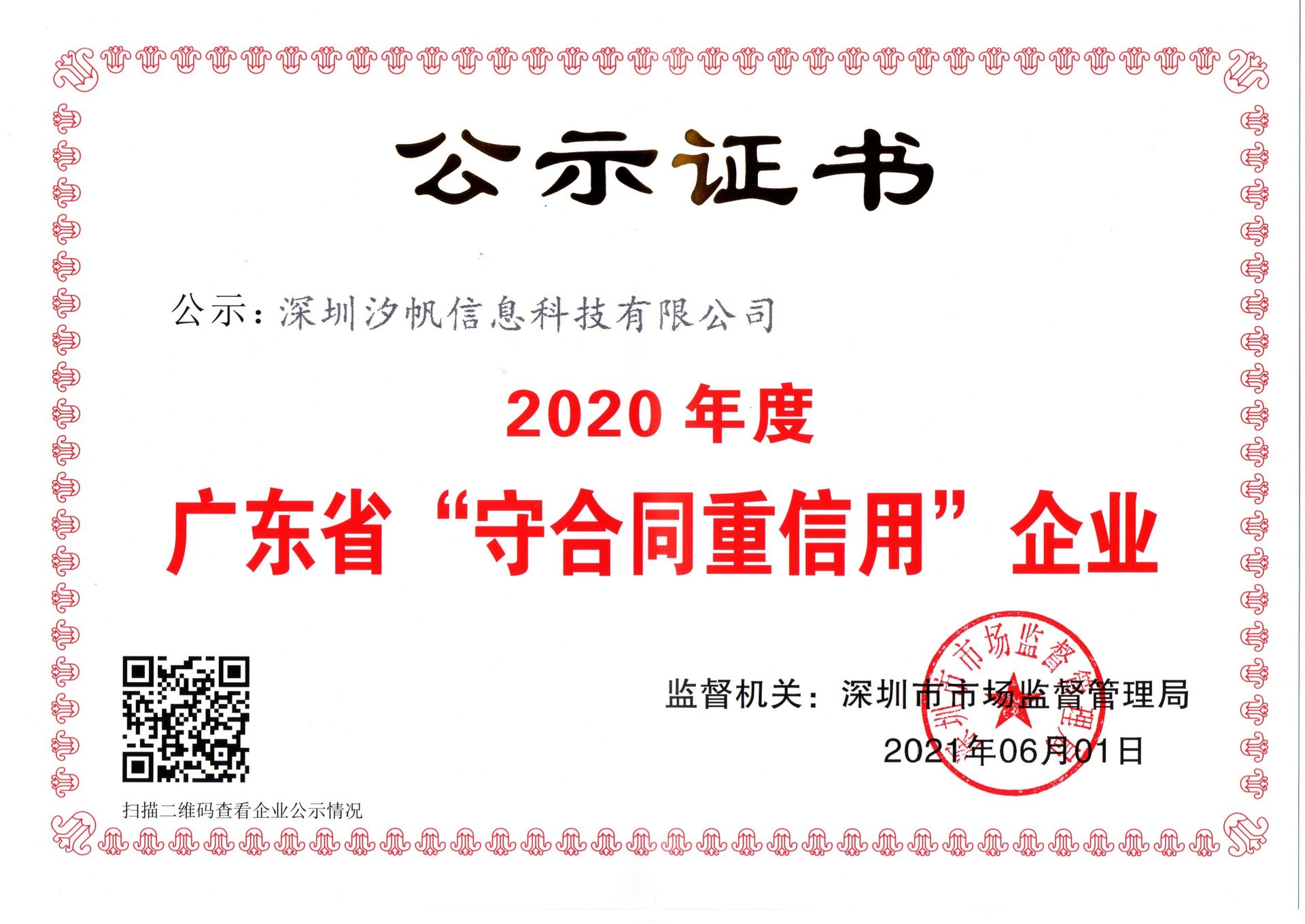 深圳市市场监督管理局对2020年度广东省“守合同重信用”企业进行公示。汐帆信息经过严格审核,通过终审,获评“广东省守合同重信用企业”称号。该荣誉用于表彰企业在守信经营的突出表现,这是汐帆多年来坚持守法经营、深入推动诚信合作所取得的成果。